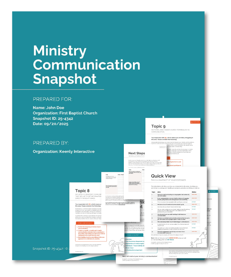 Get Your Free Ministry Communication Snapshot In just 12 simple questions you will get a clear picture of where your church's communication is strong and where it needs attention. When you finish you will instantly receive a personalized PDF that includes: A custom communication snapshot Actionable suggestions An activity worksheet Takes less than 5 minutes. This field is hidden when viewing the formOrganization Type(Required)MinistryChurchFaith Based NPOChristian Educational InstitutionFaith Based BusinessMissionaryMission Driven BusinessMission Driven NPOSTEP 1: Review these 12 StatementsAnswer YES or NO for each statement. We'll use your responses to assemble your personalized PDF kit and email it over to you.We try to avoid overloading our congregation and community with information.(Required) Yes No In our communication, we use a healthy balance of engaging people, giving details, and asking people to do something.(Required) Yes No There is a clear action associated with anything we send out.(Required) Yes No We have a church brand and communication guide.(Required) Yes No We know who our church is best wired to help.(Required) Yes No We use tools to make sure our church-wide and specific ministry communication is effectively sent to our audiences on the platforms they use most often.(Required) Yes No We allocate time in our staff meetings to talk about our communication.(Required) Yes No We have a consistent communication schedule that we use to get information out so people expect it when it comes.(Required) Yes No We avoid using insider church terminology in communication.(Required) Yes No In email communication, we use subject lines that are clear and easy to read.(Required) Yes No We make sure to have our communication reviewed for both spelling and grammar as well as information accuracy.(Required) Yes No We track engagement and activity on as much of our communication as we can.(Required) Yes No STEP 2: Almost DoneWe need a little more information to finish personalizing your PDF.Name(Required) First Last Email(Required) Church Name(Required)A few things to know. (1)The files provided are in PDF format. While they should work on most systems, we can not guarantee compatibility. (2) Files are for your church to use and should not be used for commercial purposes outside of your regular church use. (3) Files are delivered to you via email from our forms system. Your email will be added to the Keenly mail subscription system that is used to send out email updates, new resources and news. You can opt out at any time if you do not want to receive future email communication.Clicking the button below will submit your Eval. It can take 30-60 seconds to process. Once it completes this page with be redirected to a success page where you will be provided with instructions on downloading your PDF.. Respond to 12 statements and we will give you imediate access to a personalized PDF with action steps on what to be working on right now to improve your communication.
